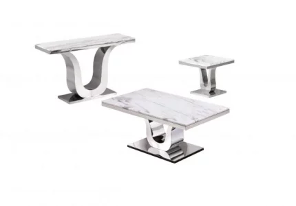 This is a classic 3pc set is perfect for giving your living room a nice classy look with the white marble top and polished stainless steel finish on these sleek coffee, end, and console tables. This Set Includes:
