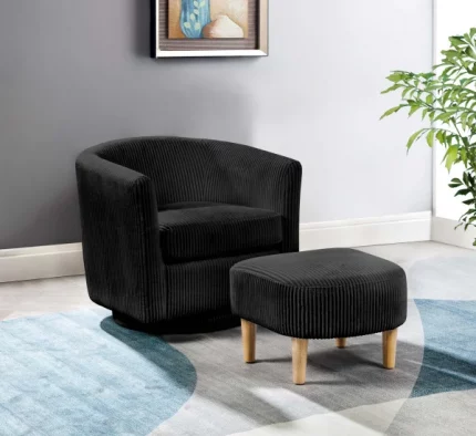 The new swivel chair offers a stylish and comfortable addition to any space. Its matching ottoman provides a cohesive look and extra comfort, making it a versatile piece for relaxation or work. The solid wood construction ensures durability and longevity, while the natural coloring adds a touch of elegance and warmth. The velvet stripe design upholstery enhances the chair’s aesthetic appeal, adding a luxurious texture and visual interest. This combination of quality materials and thoughtful design makes it an excellent choice for anyone looking to upgrade their home office or lounge area with a blend of functionality and style. This chair requires light assembly, all hardware is included in packing. Available in: Gray, Black, and White Features: