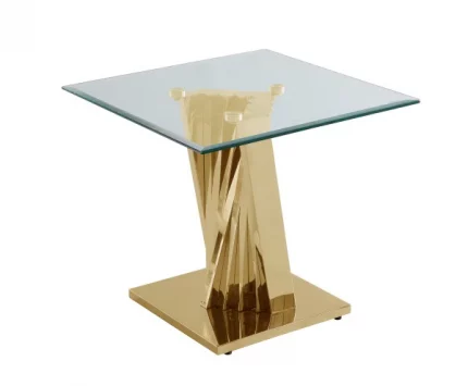 This modern glass gold end table is surely an unmatched décor. This end table piece is crafted of tempered glass 0.5″ thick mounted to stainless steel spiral design gold pedestal with foot pads. Customers can also choose the our coffee table sets to complement this glass end table. Available in silver base and gold base. Include 1 end table End Table: 24″L x 24″W x 22″H