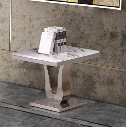 This white marble top end table with stainless steel base is perfect for adding a classy look to your living room. It has a sleek look and is a real eye catcher. Dimensions: 26″L x 24″W x 23″H Features: