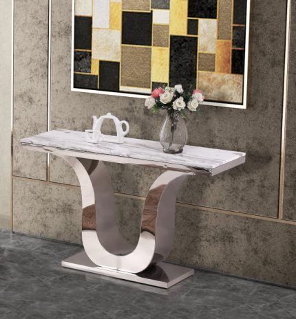 This white marble top console table with stainless steel base is perfect for adding a classy look to your living room. It has a sleek look and is a real eye catcher. Dimensions: 50″L x 16″W x 30″H Features: